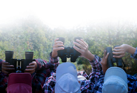 Group of friends using binoculars in the forest, travel concept