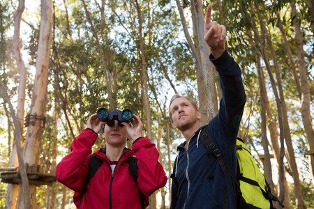 Man pointing out while woman using binoculars in the forest
