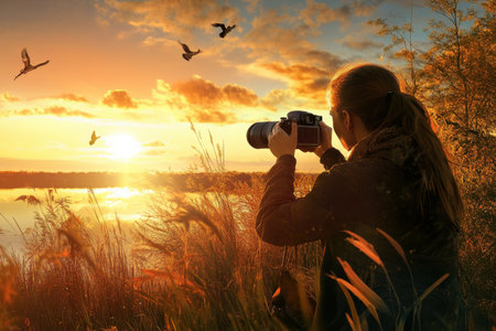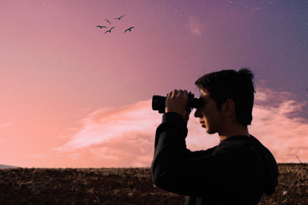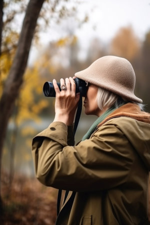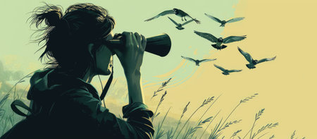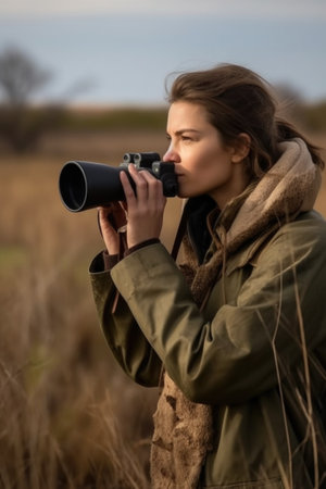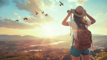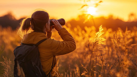 Woman birdwatching at sunset: capturing natures beauty with binoculars