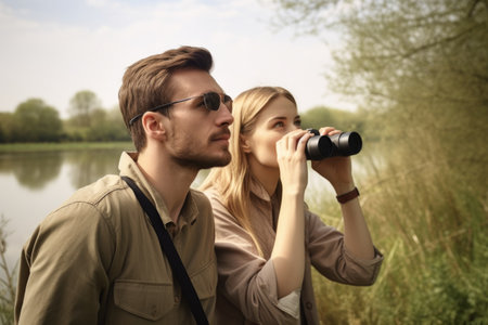 shot of a young woman using binoculars to look for birds at the nature reserve, created with generative ai