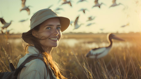 Smiling female hiker surrounded by flying birds in the wild during golden hour. a sense of freedom. A.I.