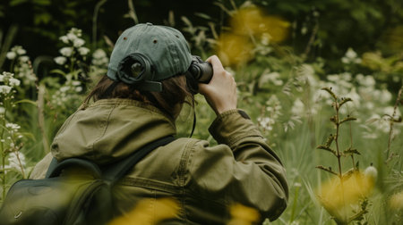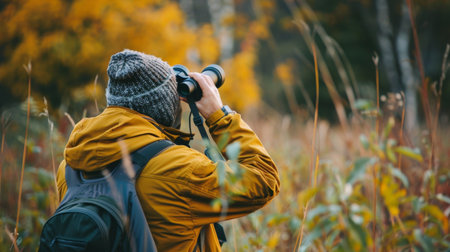 A peaceful moment captured in a nature reserve, with a person quietly observing wildlife through binoculars, underscoring the beauty of coexisting with nature and the importance of protected areas.