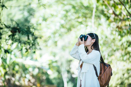 Female asian tourists in casual wear, carry a backpack, who enjoy hiking, are using binoculars in the wild.