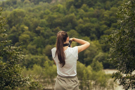 Young girl taking photo on open air. nature photographer. shooting landscape.