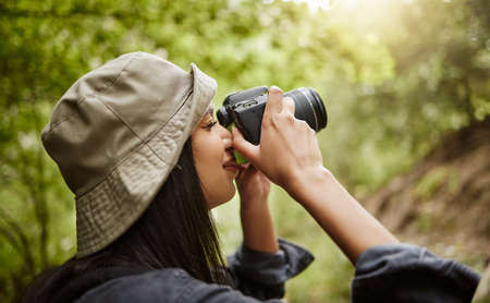 Thats a great photo. Cropped shot of an attractive young woman taking photographs while hiking in the wilderness.