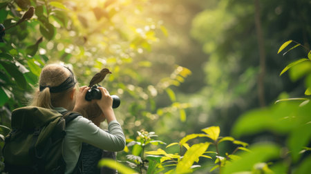 A female explorer uses binoculars to observe colorful tropical birds in a lush, dense rainforest environment. Sunlight filters through the green canopy as she crouches quietly among the foliage, surrounded by vibrant wildlife and nature.