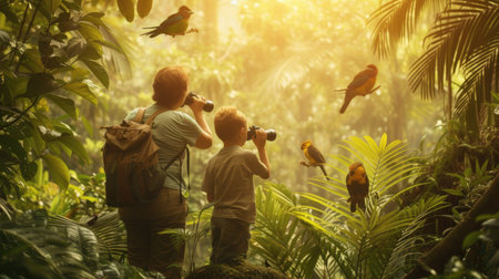 young explorers use binoculars to observe a colorful bird, immersed in the vibrant foliage of a dense forest. AIG41