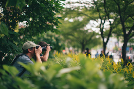 Two photographers focus on taking pictures of vibrant greenery in a bustling city park surrounded by trees and flowers, reflecting a tranquil yet dynamic atmosphere.