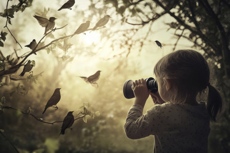 A joyful child uses binoculars to watch birds among trees during a tranquil sunset in nature.