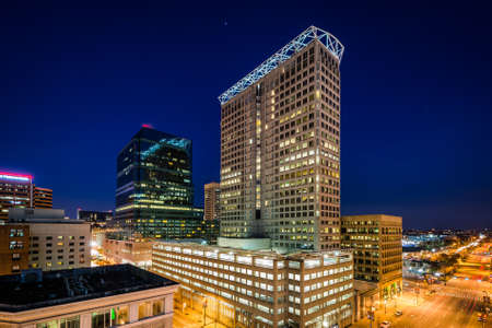 View of buildings in downtown at night, in Baltimore, Maryland.