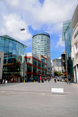 Birmingham, UK - May 14, 2014 - Bullring shops with the Rotunda to the rear, Birmingham, West Midlands, England, UK, Western Europe.