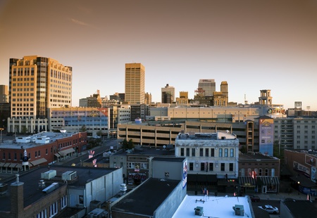 Memphis, USA - 11,28,2009: Memphis seen at sunrise during cloudless fall day in 2009. Morning light on the downtown buildings, famous for the nightlife Beale Street in the foreground.