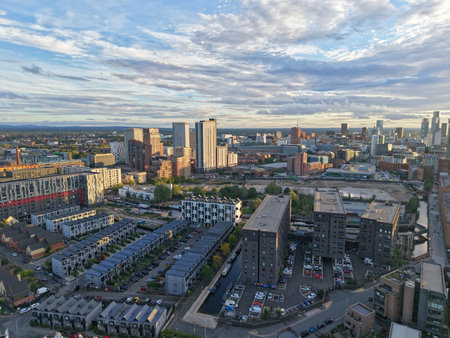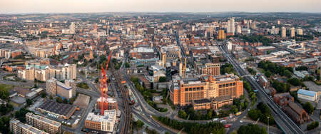 LEEDS, UK - JUNE 2, 2021. Aerial view of Leeds city skyline at sunset