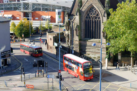 City view with the Saint Martin church and red city busesl in Birmingham, October 15, UK 2020