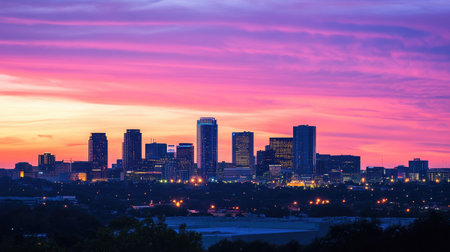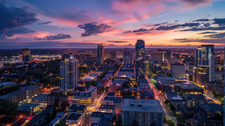 A beautiful cityscape at dusk, with tall buildings silhouetted against the colorful evening sky and city lights turning on.