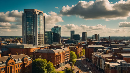 A panoramic aerial view of a Birmingham cityscape skyline in the UK with Birmingham and Aston University buildings and the skyscraper buildings in the city centre with HS2 construction site
