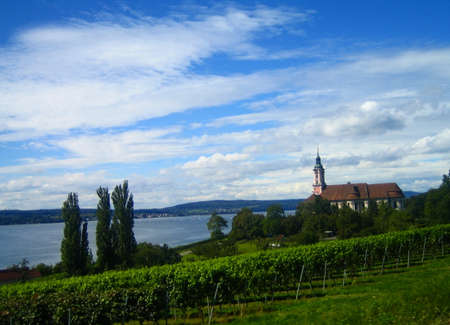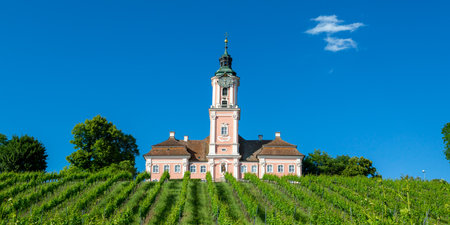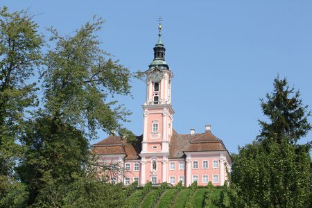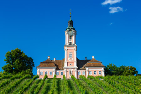Beautiful view of the pilgrimage church in Birnau at Lake Constance with the vines in the foreground