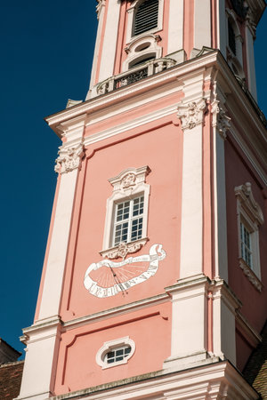 Uhldingen-Muhlhofen, Germany - October 24, 2024: Decorative church clock tower features pink facade and intricate architectural details. Zisterzienser Priorat Kloster Birnau