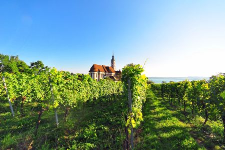Vineyard with Saint Nicholas Mountain church in Rheinau. Canton of Zurich in Switzerland