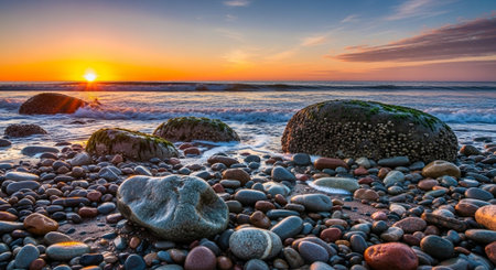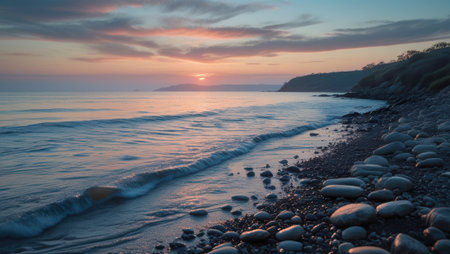 Coastal scene featuring a tranquil pebbled beach at sunset. Gentle waves meet the shore under a vibrant sky with hues of orange, pink, and blue.