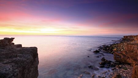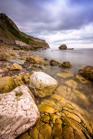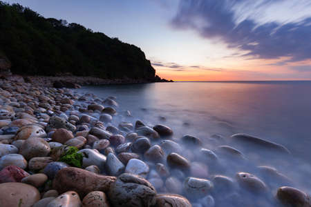 Long exposure of the sea and cliffs at sunset. Long exposure photography