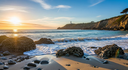 Sunset over the tranquil coastline, waves crashing on rocky cliffs generated by artificial intelligence