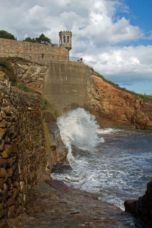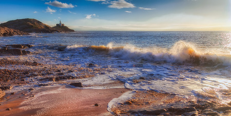 Bracelet Bay Surf Back lit waves at Bracelet Bay, featuring the Mumbles Lighthouse on the Gower peninsula in Swansea, South Wales, UK