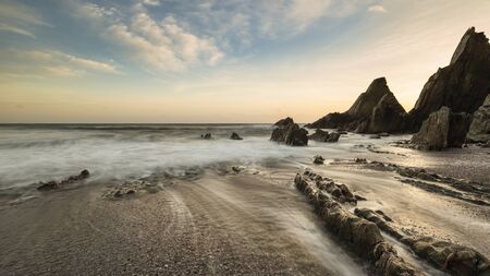 Beautiful sunset landscape image of Westcombe Beach in Devon England with jagged rocks on beach and stunning cloud formations