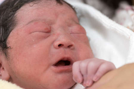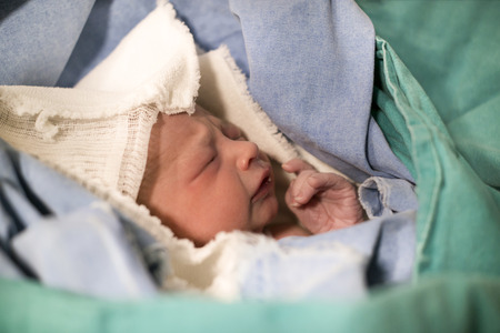 Close up newborn baby. First minutes of life. Newborn baby wrapped in the bedsheet of the hospital