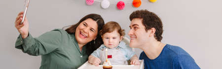 Mother father dad taking selfie photo with child boy kid. Caucasian family with baby celebrating first birthday. Cupcake dessert with one candle. Happy birthday lifestyle. Web banner header.