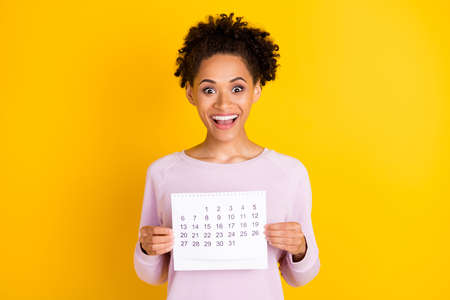 Photo of young positive dark skin woman hold hands calendar amazed isolated on yellow color background