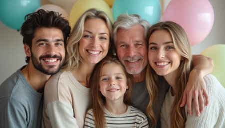 A cheerful family of five, including a grandfather, parents, and two children, smiles brightly against a backdrop of pastel balloons. Their warm expressions radiate love and togetherness, capturing a moment of happiness and connection that transcends generations.