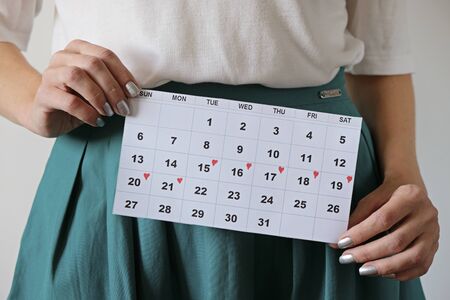 Woman holding calendar with marked menstruation dates. Woman healthcare and gynecology concept.