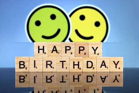 WROCLAW, POLAND - FEBRUARY 28, 2020: The words HAPPY BIRTHDAY made of scrabble letters and two smiling emoticons in the background. Studio shot.