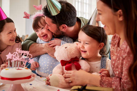 Family With Down Syndrome Daughter Celebrating Birthday With Party At Home Together