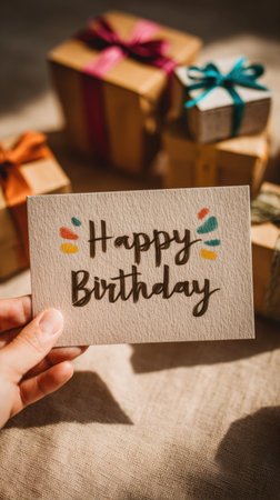 A warm scene shows a handwritten Happy Birthday card held in front of wrapped presents with ribbons, conveying celebration, gifting, and joy. Generated A.I.
