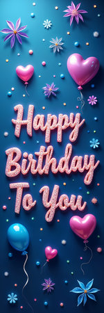 Holiday card. Festive birthday greeting with the words Happy Birthday To You written in pink and surrounded by colorful balloons, hearts, and stars against a blue background.