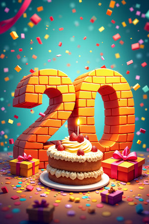 20th birthday card. Vibrant and colorful celebration of a 20th birthday, featuring a large number 20 made of bricks, a cake with candle on it, and various presents scattered around.