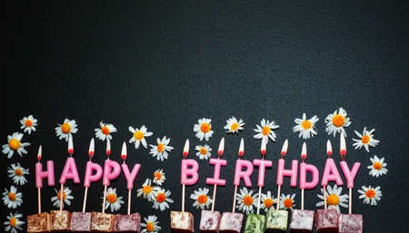 Happy birthday background copy space. Pink happy birthday candles on a black background. Happy birthday flower card.