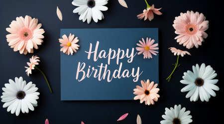 A birthday card with the words Happy Birthday is placed on a dark surface, surrounded by an arrangement of pink and white flowers, creating a festive and cheerful atmosphere.