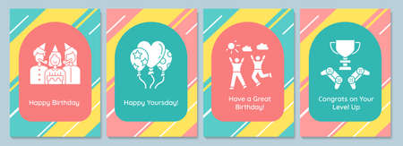 Birthday traditions greeting cards with glyph icon element set. Creative simple postcard vector design. Decorative invitation with minimal illustration. Creative banner with celebratory text