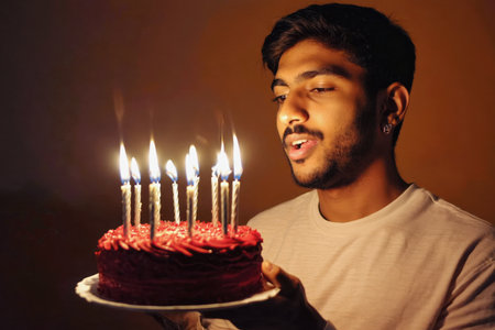 AI Generative Young man blowing out candles on cake, happy birthday celebration