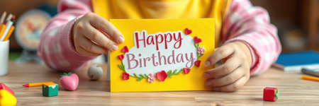Child celebrating a birthday by holding a colorful card with a cheerful message and decorative elements while sitting at a table