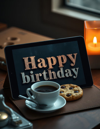 Joyful birthday celebration with coffee, cookies, and a cheerful message on a tablet in a cozy setting