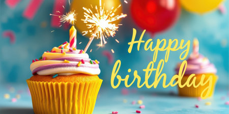 Festive cupcake with sparkler and colorful balloons celebrating a joyful birthday party moment