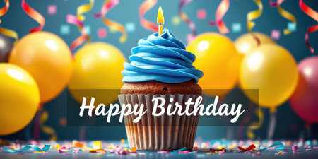 Colorful birthday celebration with cupcake, balloons, and festive decorations in a joyful atmosphere