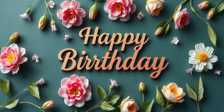 Celebratory birthday display with floral decorations and vibrant lettering in soft pastel shades