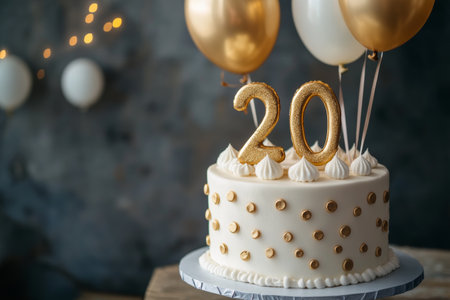Celebratory 20th birthday cake adorned with golden decorations and balloons in a festive atmosphere. Generative AI