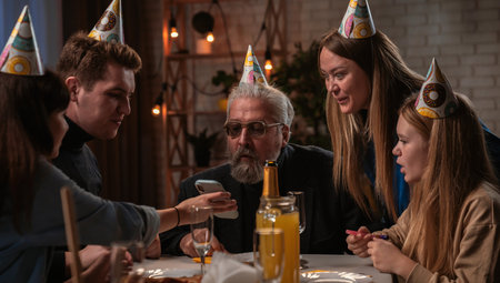 Family sit at table at home, grandchildren and parents celebrating birthday of grandfather, family members showing grandpa selfie on smartphone.