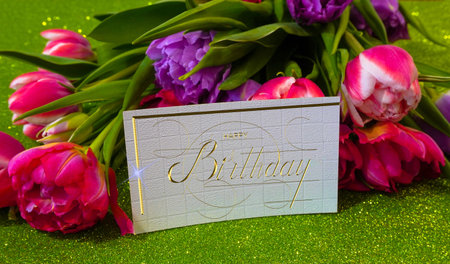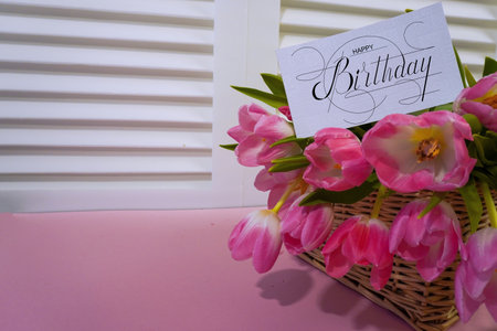 postcard , Internet banner with a birthday greeting, with the inscription - happy birthday, a bouquet of flowers with a note of congratulations, tulips